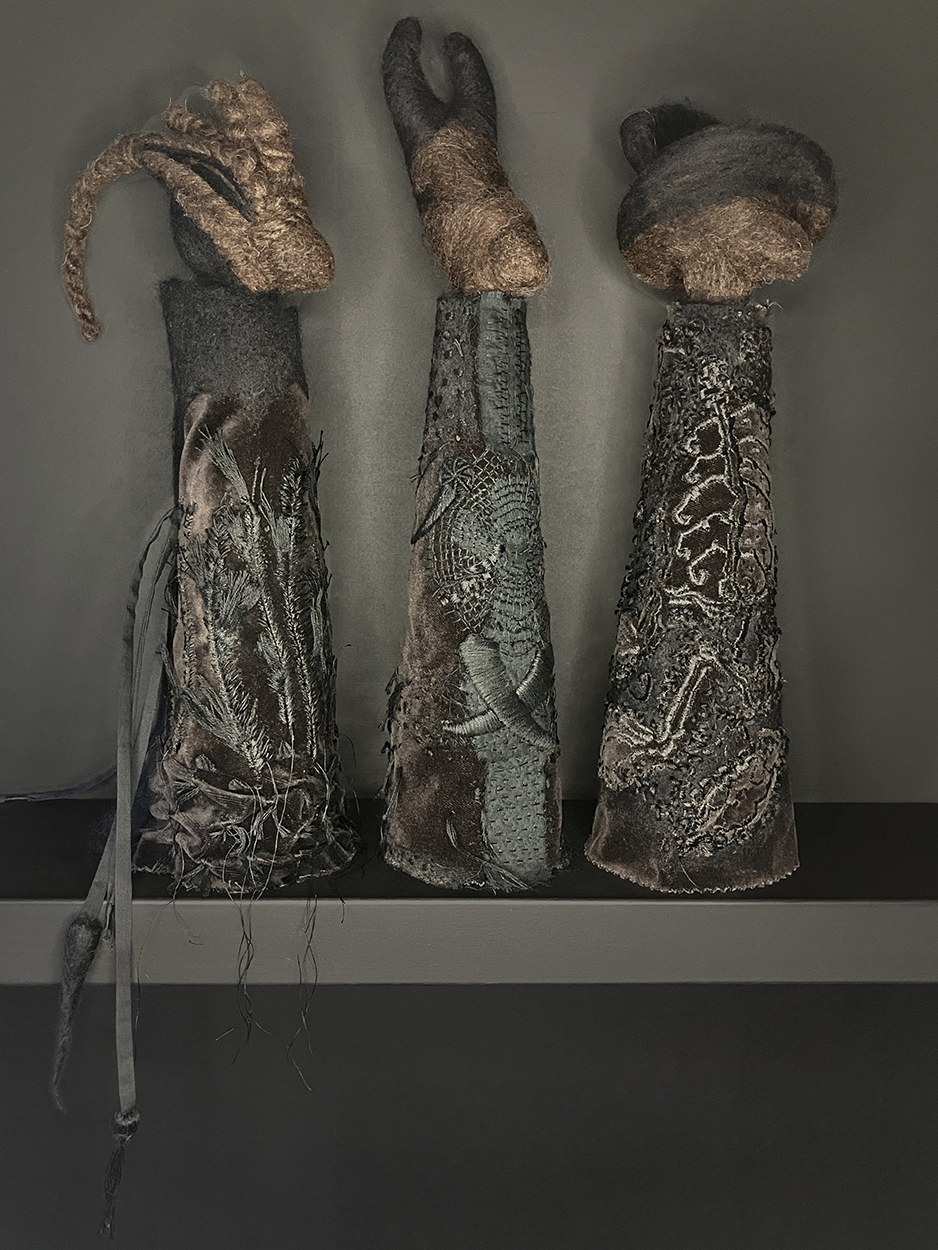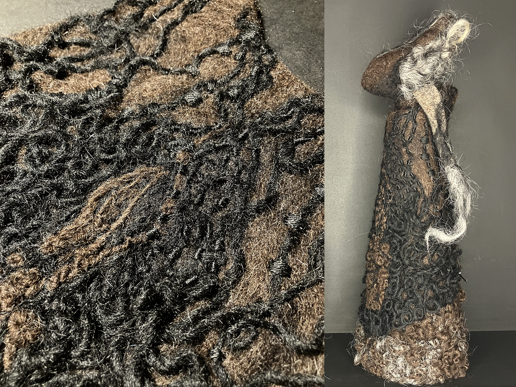 Compared to black samples, white textile examples offer a deeper understanding of the techniques used, which is why all my educational samples are made with white fabrics. Last year, I gathered a selection of white left-over scraps as part of my long-standing idea of creating a Christmas group. However, I realized that while I was crafting decent figures, they lacked the identity I envisioned for my version of the Christmas story. So, I returned to darkness and collage, focusing on what truly matters. This year I hope to add some shepherds.
